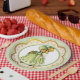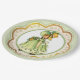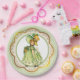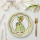 Cute Irish girl or Colleen with pretty hat and basket of shamrocks over white scalloped gold trim layer and pastel green background.