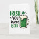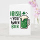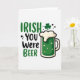 This card features a festive St. Patrick’s Day layout on a white background, mixing green and black for a crisp, high-contrast look 💚. On the left, the stacked phrase “IRISH YOU Were BEER” sits in a simple sans-serif style, with “IRISH” and “BEER” in rich green while “YOU Were” appears in black. A small three-leaf shamrock replaces the dot over the “I” in “IRISH,” adding a neat little ☘️ detail right inside the lettering. On the right, a cartoon pint glass leans into the joke, as if it’s being raised toward someone just off the page like a friendly toast. The mug is outlined in black and filled with emerald-green beer, topped with a thick cap of creamy white foam. White bubble circles float through the green liquid, giving the drink a fizzy, just-poured look. The foam sits high above the rim in rounded, cloud-like shapes, with the glass handle clearly defined along the outer edge.