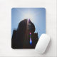 A historic steam engine rises into the midday sun in Kingman, Arizona, its silhouette framed by a bright sky and natural lens flare. The perspective emphasizes scale and strength, capturing a moment where industrial history meets harsh desert light.