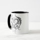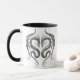 Two tribal dragons face each other in this aggressive symmetrical design. The winged serpents have the appearance of being cast out of solid iron which creates a stunning 3D look. The metallic texture and deep silver colour gives this mug design a stylish look.