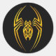 A cast iron spider design with sharp points and simple stylish lines. This metal arachnid has four of its legs reaching up and four pointing down creating and aggressive, symmetrical pattern. The yellow colour of the spider and the pure black background creates a striking contrast on this sticker.