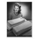 Woman sitting at pile of ironed linen and towels (B&W), portrait | George Marks | AssetID: 72131160