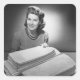 Woman sitting at pile of ironed linen and towels (B&W), portrait | George Marks | AssetID: 72131160