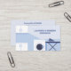 A Business Card for a Laundry & Ironing services at home or pressing. There is an illustration in blue tones of a laundry room with a washing machine, an iron and an ironing board.