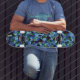 Irregular and disorganised mosaic overlaid blue skateboard