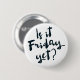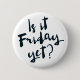 This funny button features a chunky script and the words Is it Friday yet?