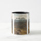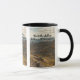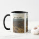 This two-tone mug showcases a unique magenta print font with black letters light blue outline with the "Isaiah 30:1" KJV bible quote scripture over a picture displaying a rugged valley with multiple hills and trails under a cloudy light blue sky with mountains in the distant background in this bible quote theme from the King James bible. The rim & handle are glazed in matching colours available in 11-ounce or 15-ounce sizes microwave and dishwasher safe ceramic construction.