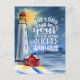 Inspirational quote scripture postcard depicts a watercolor lighthouse with the light shining through the blue snow filled night sky. It features a portion of Bible Verse Isaiah 60:20, "The Lord will be your everlasting light."