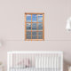 Sparkling Sea with an Island Scene In this window scene the sun is shining on the shallow waves and ripples at the edge of the seashore. The window frame looks out onto a beach and across the sea to an island with a ruined abbey beyond. There are hills in the distance. The sky is blue with billowing cumulus clouds. This tranquil scene is framed by a wood window.