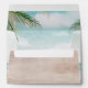 Island Breeze Painted Beach Scene, with Ocean Waves, Sandy Beach, and Palm Trees, with a beautiful teal blue sky. With Modern Typography Script Fonts. A Summer Tropical Beach, Or destination wedding design - Personalised Wedding Monogram Envelopes with Inside Design!