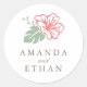 Island chic personalised stickers are designed to match our Island Hibiscus wedding invitation collection, with the couple's names in elegant taupe lettering with a tropical hibiscus flower illustration in coral and green.