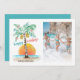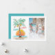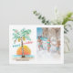 Tropical beach theme flat Christmas photo card features an island in the sun with a palm tree decorated with string lights and ornaments and a "happy holidays" greeting along with a space to replace the sample photo with your own. Art by KL Stock