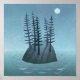 A remote island in the middle of the ocean with pine trees. The moon is shining on this peaceful scene, and adventrure beckons! Original seascape painting by Nic Squirrell.