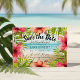 Tropical save the date cards feature a watercolor beach, pink and coral hibiscus flowers and palm leaves that surround your names, wedding date, location and wedding website or other info. Reverse side is beautiful ocean blue. Personalise with your names and wedding information.