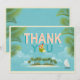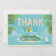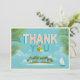Tropical island, sailboat, palm trees, and seagulls beach destination thank you card.