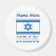 Round magnet featuring the blue and white Israeli flag with the Star of David and the word ISRAEL below in the colours of the flag. Above, a spot for a name. You can add your name for a personalised touch to this trucker hat, or, someone else's name for a customised gift. Fun for mementoes of family reunions, travel groups, and clubs. Fun stocking stuffer or a little extra something for Hanukkah.