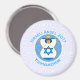 Round magnet features an angel wears the flag of Israel and flies in the centre of a digitally created, textured, blue circle. The primary colours in this design are blue and white, chosen with Hanukkah in mind. Blue letters read ISRAELI ANGEL and make a space for the year and a name, allowing you to create a customised gift or personalise your look. Background is white squiggly squares. Fun stocking stuffer, especially for families of multiple religions.