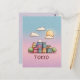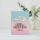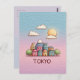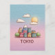 This travel postcard showcases a vibrant illustration depicting a cityscape of Tokyo with pastel colors, featuring houses, trees, and a mountain in the background.