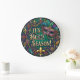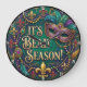 Get ready to let the good times roll with this ultra-chic Mardi Gras wall clock! This stunning piece captures the glamour of carnival season with a lush 3D-style illustration featuring an ornate purple and gold masquerade mask adorned with vibrant teal feathers. Sparkling emerald and amethyst beads drape across the teal and violet swirling background, accented by golden fleur-de-lis symbols. The center features the playful and festive phrase "IT IS BEAD SEASON!" in elegant golden typography. This clock is the perfect self-gift for the woman who loves to celebrate in style, bringing a touch of New Orleans magic to any room. You can fully customize the text and name to make it your own! Available in 12 brilliant frame colors and backed by a guarantee for life, this timepiece is a joyful celebration of color and fun.