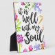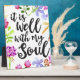 Modern hand-lettered style typography design with words, "It is Well with my soul" words from the well-known hymn. Type is surrounded by colourful watercolor flower border on all sides.