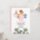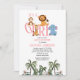 IT'S A GIRL is an adorable baby shower invitation that has a baby zoo animal theme. This fun design features a monkey, giraffe, lion and elephant in the main title. At the bottom of the invitation, there are palm trees and green foliage. On the back of the invitation, there is a pink and yellow striped pattern, over a grey background.