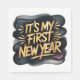 A graffiti-style text art piece on a white background with black outlines. The text reads "IT'S MY FIRST NEW YEAR" in bold, stylized lettering with a metallic gold gradient effect. The letters have a 3D shadow effect created by black outlines that create depth and dimension. Small decorative gold splash marks are positioned around the text, particularly near the top and bottom. The text is arranged in four lines, with "IT'S MY" on top, "FIRST" in the middle, and "NEW YEAR" at the bottom. The lettering style is modern and urban, with smooth curves and sharp angles characteristic of contemporary street art. The entire piece has a clean, professional finish with sharp contrast between the gold text and white background.