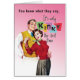 Vintage 1950s midcentury couple have the gleam of mischievous love in their eyes. Front of card: You know what they say, It’s only kinky the first time. Inside: After that, it’s amore baby. Let’s see what we can do to fulfil those Valentine’s Day wishes and desires of yours.