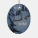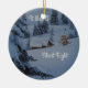 This design features a photograph of a cabin house in the snowy woods at night. This peaceful and serene scene captures what winter and Christmas past might have been like. The evergreen tree near the house is decorated with Christmas lights in preparation for Santa Claus’ visit.