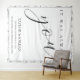 The design is elegantly framed by a crisp double-lined square border and a delicate black and white hand-drawn botanical floral pattern. Below the central quote, you can easily personalize the tapestry with the names of the couple, your wedding date, and the venue location to create a one-of-a-kind keepsake. Its clean monochrome aesthetic makes it a versatile choice for modern, garden, or industrial-chic wedding themes.
