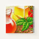 Italian cooking illustration of tomatoes, garlic, basil and olive oil.