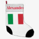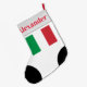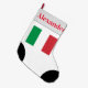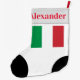 This Italian pride inspired Christmas stocking features a white background with an image of the Italian flag printed across the centre portion. circle near the toe and ankle give the stocking a sports sock appearance. A sample name is printed in the top portion below the Italy flag, in an elegant green font which you can personalise to include your own custom name, message, or quote.