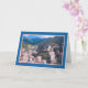 Greeting card features photo of an Italian hillside village whose buildings appear to be almost "tumbling down" its hillside. Beautiful rolling hills and pastel coloured buildings. Card is blank for your own message.