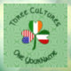 This shamrock celebrates the holidays of three countries: Italy, Ireland (like St. Patrick's Day), and USA (like Independence Day or July 4th). A different flag is in each leaf. You will see the Italian flag, Irish flag, and the flag of the United States of America. Above the shamrock reads THREE CULTURES. Below, it reads ONE YOURNAME. Add your name in the correct place to personalise. To make a customised gift, add someone else's name. Words appear in dark green, Celtic style, circular letters. All of it sits on a background of light green squiggly squares.