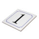 Patterned after a street sign seen in Italy. Narrow blue border with reverse circle filets at the corners. Ceramic number tiles. You customise with the numbers or letters you need for your ceramic tile or mosaic sign.