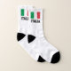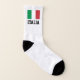 Italian pride flag of Italy personalised sport socks. Flag of Italia design with personalised monogram letters. Add your own name, monogram initials, funny quote, saying or slogan. Cool clothing accessories for sports events, national holidays, heritage reunions etc. Novelty Birthday gift idea for him or her. Create your own white tennis socks for workout, gym, fitness, athletics, soccer, basketball and more. Available in small and large sizes for men, women and kids. Tricolore flag with black lettering. Customisable with your own flag, logo or funny graphic. Promotional wear for personal use, company or business.