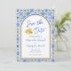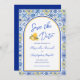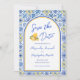 Destination wedding save the date invitations featuring Italian blue white yellow tiles and a trendy chic arch inspired by a Mediterranean summer in Positano on the Amalfi Coast. Elegant script typography and watercolor lemon gelato details create a stylish, romantic design perfect for a timeless European or coastal celebration. Please contact me if you have any requests for custom products.