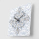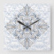 Beautiful Italian Tile Designed Wall Clock in Dusky Blue with khaki tan design over Victorian baby blue and white ornate background.