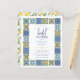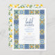 Invite family and friends to celebrate the bride-to-be with this Mediterranean-themed shower invitation! A classic combination of lemons and blue tiles. This style is popular all over Italy, such as in Positano on the Amalfi Coast, Tuscany, Sicily, and the islands, as well as areas of Greece, Portugal, and Spain. The front of these cards is decorated with a frame made up of different Italian tiles, all in a navy blue and yellow colour scheme. The text appears in chic hand-lettered script calligraphy and elegant serif typography. The bride's name appears in light blue. We have chosen to showcase the name in lowercase letters, but this can easily be changed. To get the venue name and RSVP slightly larger than the rest of the shower details, we used all caps. Perfect for a spring or summer event. A citrus theme is great for cocktails (such as mimosas and lemon drops) or refreshments, displays, and botanical decor, or simply to add a sunny touch to your event! On the back of the cards, there is a pretty pattern of watercolor lemons, leaves, and flower blossoms. To get started changing names and event details, click on "Personalise this template" and edit the wording in the template boxes. To access the more advanced editing tools, scroll down to "Click to customise further". Once you are in Zazzle's design tool, you can edit fonts, placement, colour, sizing, and more! Just note that "bridal" cannot be edited as it was hand-written. If you message me through the button below, I'll be happy to write something else for you, to work on something together, or answer any questions! *ABOUT BUDGET PAPER* The budget range of stationery has two options: Satin: THIN 80lb paper and Semi-Gloss: 110lb cardstock. We recommend the semi-gloss finish for a more durable invite, but you can choose according to your needs. More variety is available with the flat cards, but they are not included in the budget selection. You can find them in my store. Please note the invites will be printed and shipped to you exactly as you see them on your screen, and I can't modify an existing order, so contact me before purchasing if you would like something changed!