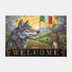 Italy Welcome Doormat featuring modern art with patriotic Italian Flag, wolf and deer in Art Nouveau style. Original fun house mat for any occasion. Easily customise "welcome" text.