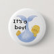 An adorable baby boy in a blue blanket and kid style text that reads "It's a boy!" on baby announcement buttons and magnets.