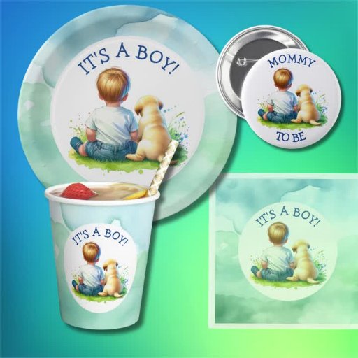 It's a boy Baby Shower paper plates. A baby boy sitting next to a Labrador Puppy Dog watercolor style ai art.
