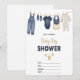This sweet design features a whimsical clothesline strung across the top, displaying darling baby boy outfits in soft navy blue and cream tones: denim overalls, tiny blue booties with bows, a navy that proudly says “IT’S A BOY,” a coordinating star bib and striped shorts, plus a matching star-patterned footed