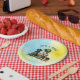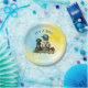 Cute It's a Boy baby shower plates Blu and yellow baseball themed baby shower. A vintage baby boy sitting next to a dog, a Black Lab with a baseball cap, bat and glove. Blue and yellow background.