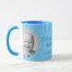 A sweet blue baby celebration mug featuring a cute koala, sitting on a gift box and balloon watercolor painting. Personalise with your own baby boys name and birth date and two special photo's. A great commemorative gift for a newborn baby. Original art and design by Sarah Trett for www.mylittleeden.com on zazzle.