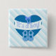 Cute adorable Baby boy shower button gift: Blue heart with a bow, blue baby shoes, banner and text It's a boy on Light blue and white stripes.
