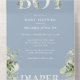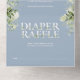 A stylish dusty blue all-in-one baby shower invitation featuring elegant floral greenery typography. Add your special celebration details to create the perfect invitation. It includes a diaper raffle or other cute baby shower request card. Designed by Thisisnotme©