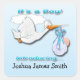 features a light blue gradient background, a stork carrying a baby Boy flying by a cloud. Stylised text is It's a Boy, Introducing. Just add your new baby's name! Envelope seals Perfect for It's a Boy Stork birth announcements! Matching items including birth announcement, postage, are also available in our shop.