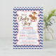 Modern western bold & bright cowboy baby shower invitation featuring a cute cowboy on a rocking horse wearing a red diaper and brown cowboy hat and boots. Our It's a baby boy baseball invite is set on a blue chevron zigzag background and has a matching back for an extra special touch. Perfect for a western baby boy baby shower