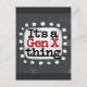 "It's A Gen X Thing" is a cute text design in grey with black and red text, along with a white accent shape and white textured whimsical dots surrounding it.