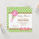 This adorable baby shower invitation features a girl theme with a pink baby rattle with the text: It's A Girl! The top and bottom border is lime green with white polka dots and light brown accents. The centre of the invite features customisable text for a shower details.